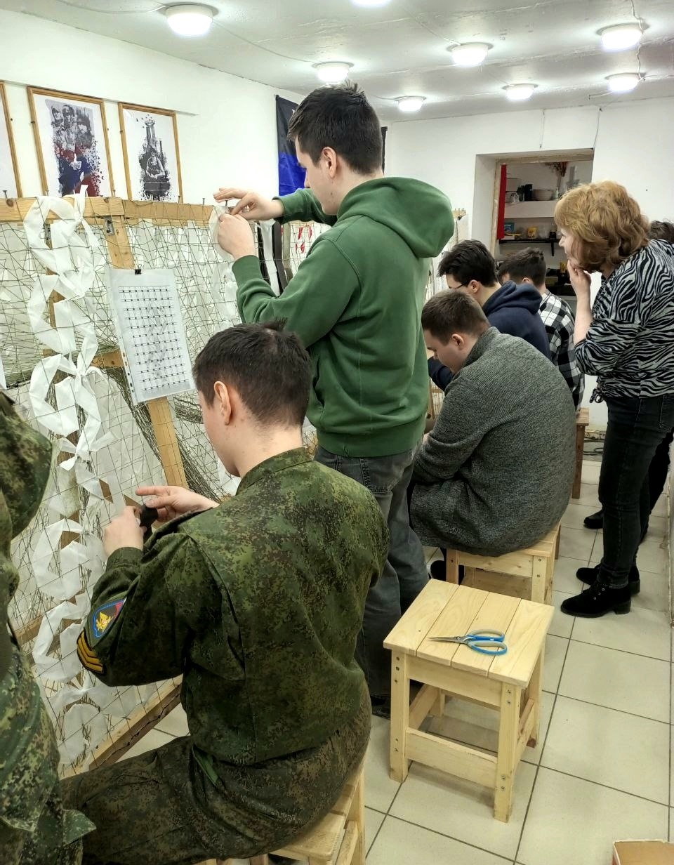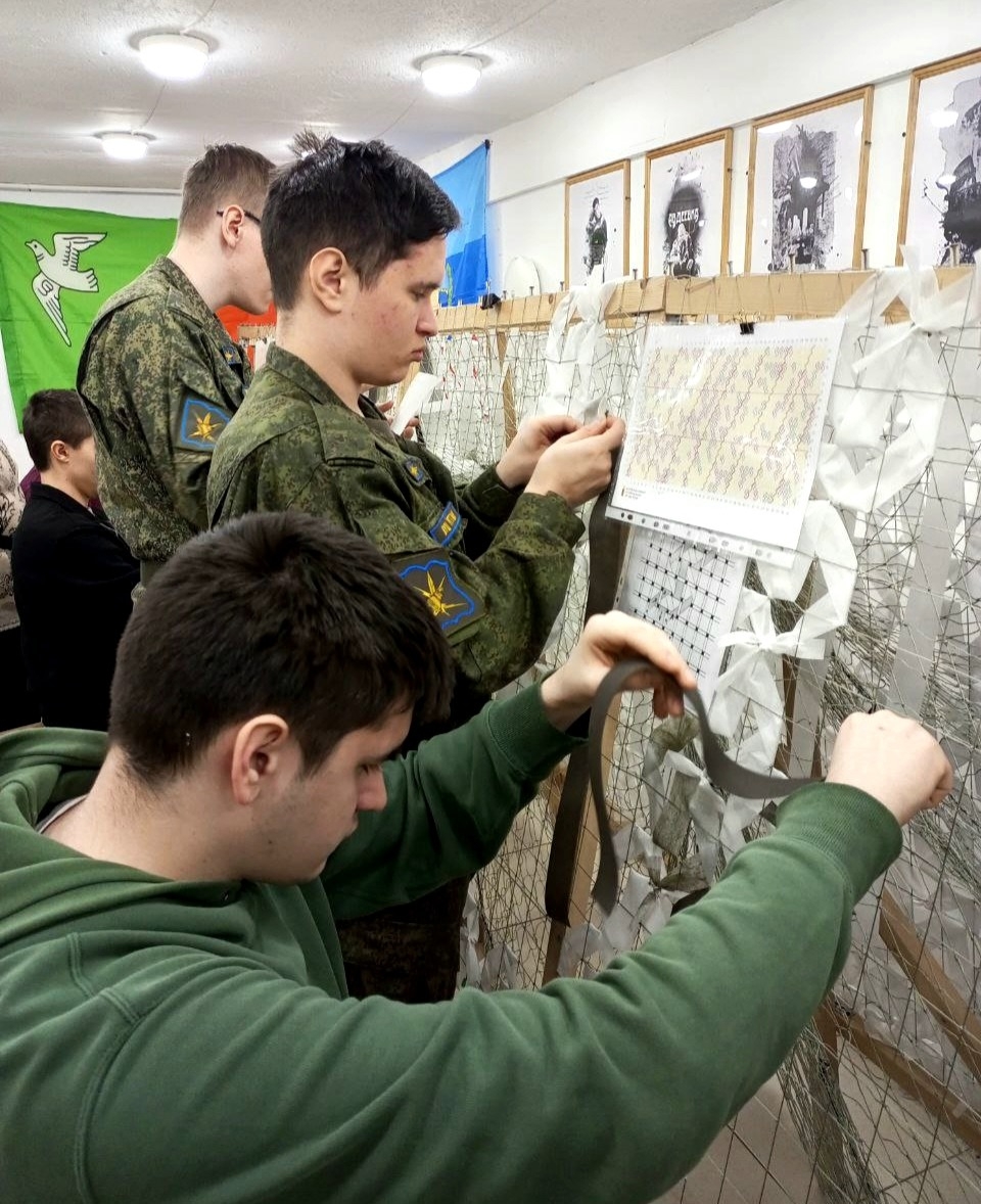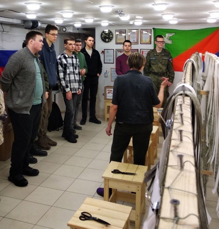 Так вот. Нашими гостями в тот день были курсанты военно-учебного центра Российского государственного гидрометеорологического университета (РГГМУ). Командование ВУЦ и обучающиеся там ребята сами проявили инициативу и захотели научиться плетению масксетей для того, чтобы приносить реальную пользу фронту! И конечно же мы с удовольствием показали им все ступени этой очень нужной для Отечества работы, а сами курсанты проявили себя на мастер-классе с самой лучшей стороны.