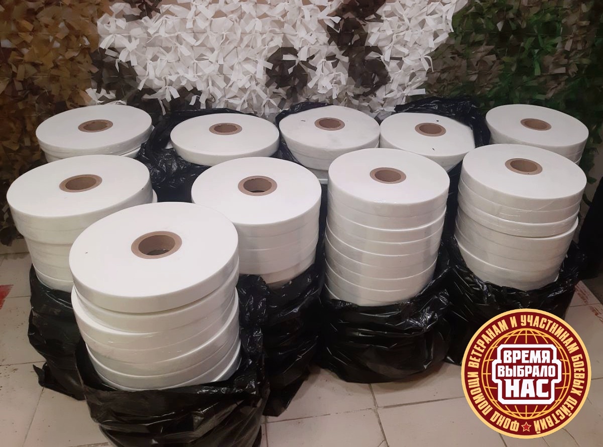Приобрели партию белого спанбонда для плетения зимних маскировочных сетей. Стоимость закупки составила 49 000 рублей. А компания «Z» обеспечила нам нарезку рулонов на бобины и их доставку в штаб Фонд "Время выбрало нас" .
